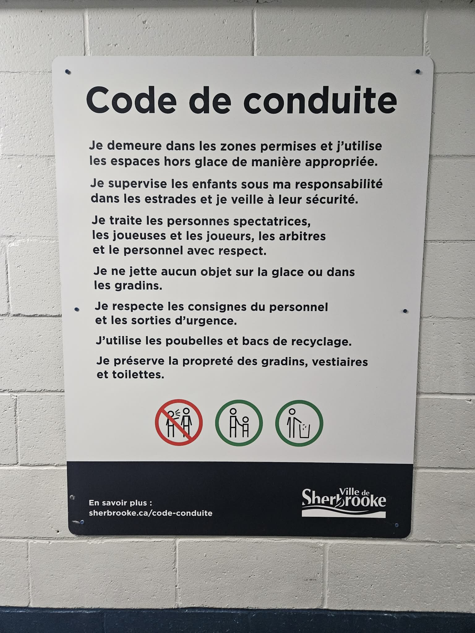 La Ville de Sherbrooke a mis en place un nouveau code de conduite dans toutes les installations sportives, et il est maintenant affiché dans nos complexes. Complexe Sportif Forage FTE et à l’Aréna Philippe-Bergeron.
