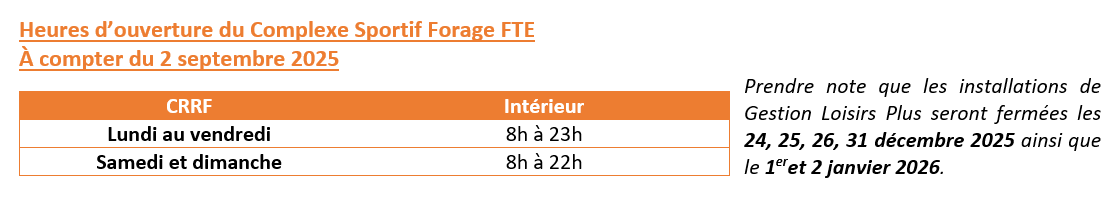 En se présentant au Complexe Sportif Forage FTE, l’utilisateur accepte de se conformer aux règlements du Complexe tels qu’énoncés dans ce document. Le Complexe se réserve le droit de résilier la carte de membre et/ou suspendre l’accès si ce dernier ne se conforme pas aux règlements.